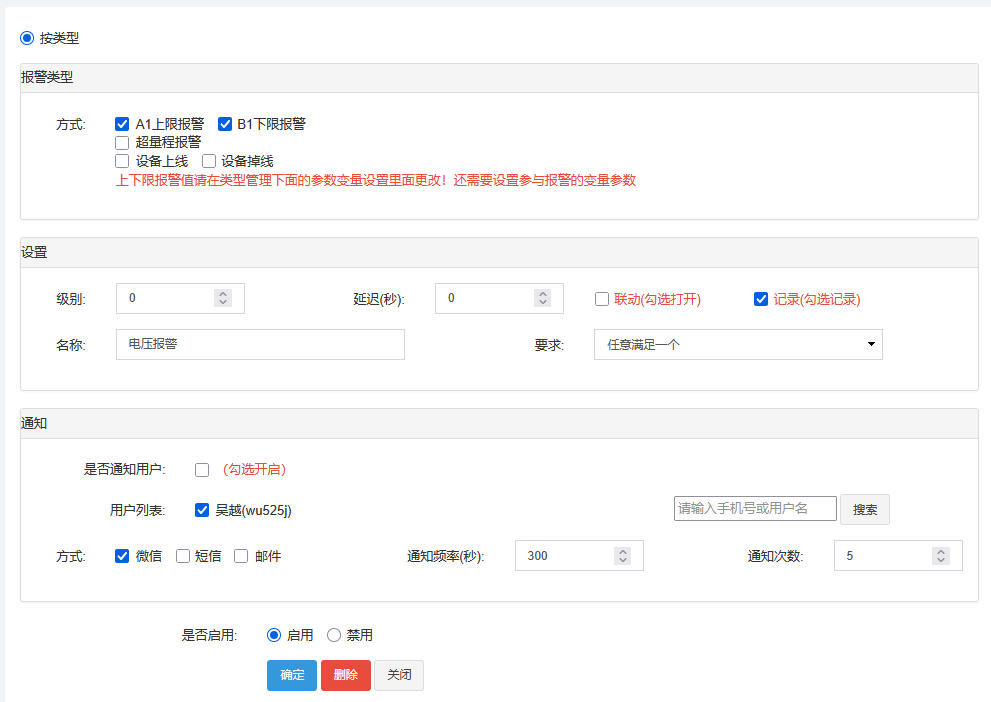 可在后臺對設(shè)備的狀態(tài)、設(shè)備參數(shù)設(shè)置報(bào)警,如掉線報(bào)警、上下限報(bào)警等。報(bào)警設(shè)置中可以設(shè)置需要通知的管理人員,包括通知幾次,通知方式(微信、短信等)。