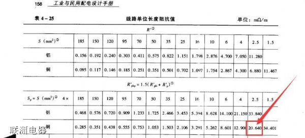 從圖中可以看到,當線路的短路電流為斷路器額定電流的5~10倍的時候,斷路器可能在0.02S以內就跳閘,基本實現瞬間跳閘;也可能在10S以內才跳閘,不能保證能瞬間跳閘。為了保證斷路器可靠的跳閘,我們希望線路的短路電流超過10倍的額定電流,也就是可靠的斷路器瞬時過電流脫扣器整定值為16Ax10=160A。另外,《低壓配電設計規范》GB 50054-2011第6.2.4條規定:當短路保護電器為斷路器時,被保護線路末端的短路電流不應小于斷路器瞬時或短延時過電流脫扣器整定電流的1.3倍。那么線路短路電流應不小于160Ax1.3=208A。根據歐姆定律R=U/I可知,該線路的阻抗值不應大于220V/208A=1.057歐。翻開工業與民用配電設計手冊第三版的表4-25,可以看到2.5平方的銅電線的單位長度阻抗值為20.64毫歐/米。