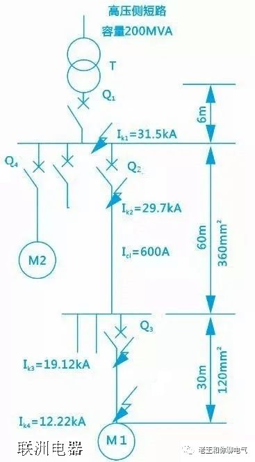 電動機M1、M2均為輕載起動,ICL=600A,試選用各級斷路器。選用前對各級故障點進行了短路電流計算,計算結(jié)果為IK1=31.5kA,Ik2=29.7kA,Ik3=19.12kA,Ik4=12.22kA,末端單相對地短路電流I´k4=4.9kA。