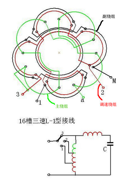 圖中1,2,3分別表示高中低三個速度,a是公共端,M是電容端,電容接到a和M之間。 此繞組結構相對簡單,線圈數量較其他形式的繞組要少,且調速性能較好。是三速電機應用Z多的一種繞組形式。