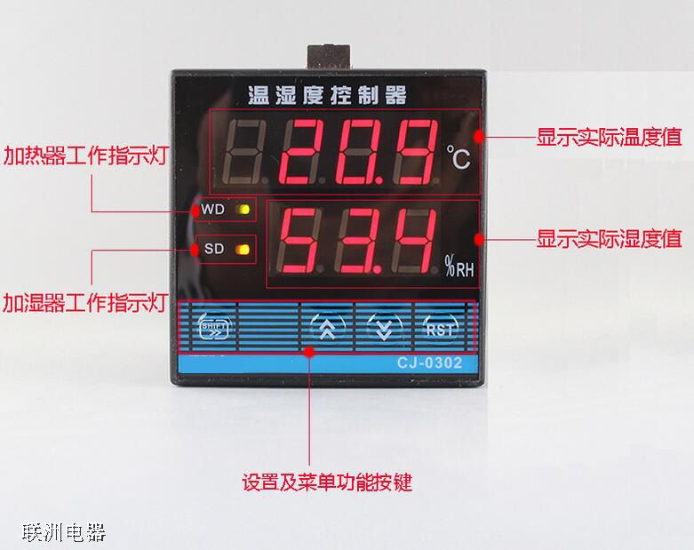 主要功能:一路凝露,一路溫度實數顯精密控制。按鍵設定控制值,自動控制相應負載來調節環境的溫度和濕度。