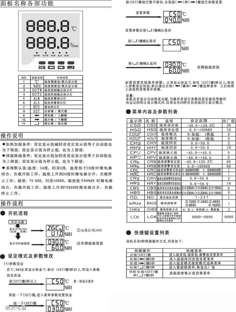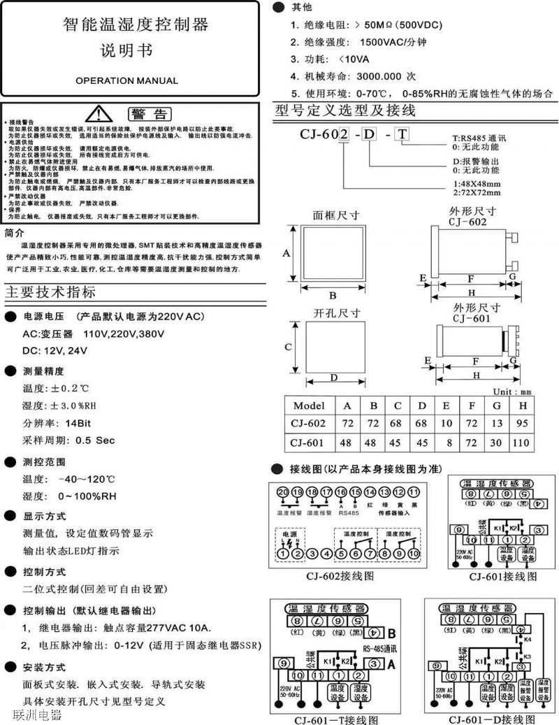 環(huán)境條件:溫度10~40攝氏度,濕度80%;溫濕度監(jiān)控儀表滿足:1)當(dāng)空氣濕度高于40%+5%時輸出報警(無源觸點開關(guān)信號);2)空氣溫度和濕度雙重監(jiān)控,溫度的監(jiān)控采用隨動式溫差控制方式,不采用設(shè)定值固定控制,即測量室內(nèi)溫度-室外溫度小于1攝氏度以上時輸出報警無源開關(guān)接點信號,可以啟動加熱器,直至室內(nèi)溫度-室外溫度高于5攝氏度時停止輸出報警無源接點信號,停止加熱;3)室內(nèi)相對濕度高于40%+5%時輸出報警無源接點信號,可以啟動加熱器,直至室內(nèi)空氣相對濕度低于30%時斷開該接點信號,可自動斷開電加熱器;4)測到的溫濕度參數(shù)可通過MODBUS RS485通訊口遠(yuǎn)傳;5)測量精度不低于0.5級;6)儀表應(yīng)防潮,絕緣性能好;7)具有一D的抗震能力和風(fēng)壓能力;8)弱電回路絕緣電阻常溫時大于100M歐姆,180攝氏度時,絕緣電阻大于50M歐姆。
