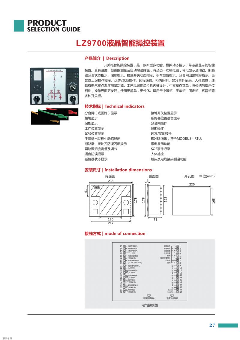 XKY-CK6800開關(guān)柜智能操控裝置產(chǎn)品功能強(qiáng)大,適用于3KV-35KV 戶內(nèi)開關(guān)柜,手車柜、固定柜、中置柜、環(huán)網(wǎng)柜等多種開關(guān)柜。具有動態(tài)一次模擬圖、高壓帶電顯示、斷路器分合狀態(tài)指示、儲能指示、接地開關(guān)狀態(tài)指示、自動加熱除濕數(shù)據(jù)顯示及控制、小車位置指示、分合閘回路完好指示、人體感應(yīng)及柜內(nèi)照明、語音防誤提示功能,本裝置可取代現(xiàn)有的一次回路模擬圖、帶電顯示器、自動加熱除濕控制器、斷路器分合按鈕等獨(dú)立安裝的設(shè)備。具有RS485通訊接口,MODBUS通訊協(xié)議。使開關(guān)柜進(jìn)一步智能化、數(shù)字化、網(wǎng)絡(luò)化,方便廣大用戶使用與操作。