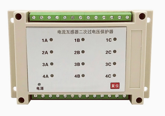 電流互感器保護器是多回路保護器。安裝于開關柜二次導軌上。保護器本身有復位按鈕,有遠程復位端子(J1、J2)可以延伸到操作部位,保護輸出的同時有繼電器的閉合觸點輸出(K1、K2)可以用于自動化連鎖。