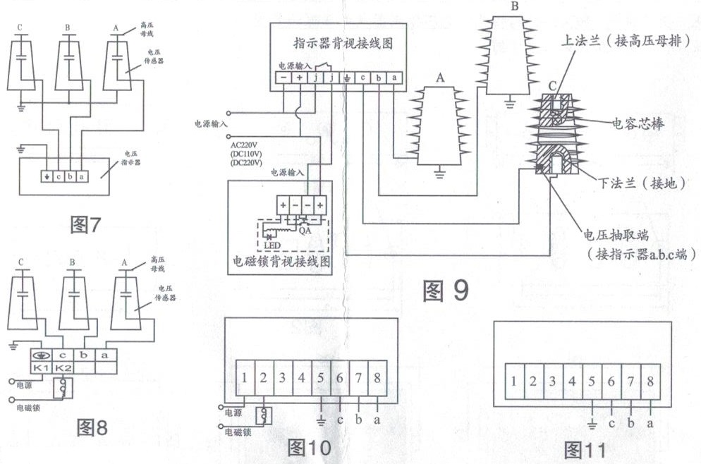 T型電壓指示器:當高壓端電壓在額定相電壓15%~< 65%,指示燈開始分別指示高壓端帶電狀況;(與電壓傳感器配套使用接線圖見圖6)。