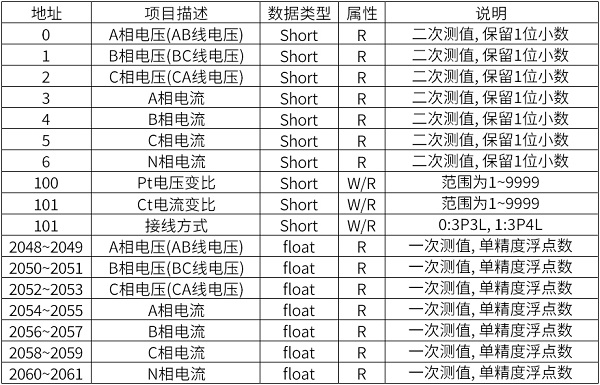 (4) 寄存器地址0,1,2,2048~2049,2050~2051,2052~2053三相四相接線方式,讀出的為相電壓,三相三線接線方式,讀出來的線電壓。