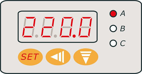 A、B、C三相LED指示燈,僅A指示燈亮,代表當前電壓為A相電壓;當A,B二指示燈同時亮,代表AB相線電壓。220.0為顯示的電壓值,單位為V,顯示值為二次側電壓值。通過“▼”鍵切換顯示的相。