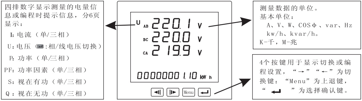 三排數字顯示測量的電量信息和編程時提示信息,分頁顯示:V:電壓,I:電流,P:總有功功率,Q:總無功功率,PF:總功率因素,F: 電網頻率,QA: A相無功功率,PFA: A功率因素,QB: B相無功功率,PFB: B功率因素,QC: C相無功功率,PFC: C功率因素;