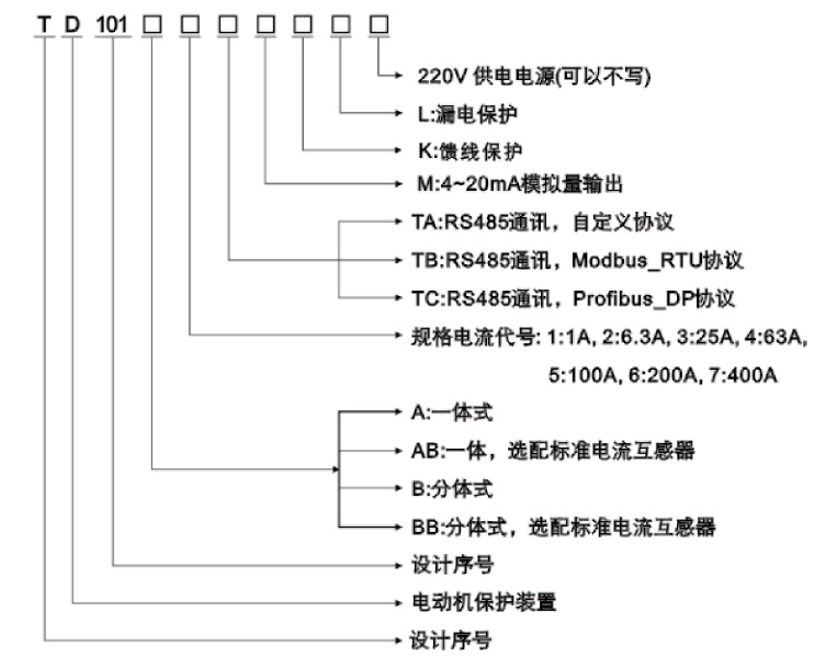 TD101電動機保護裝置具有抗干擾能力強、工作作穩定可靠、精度高、保護參數設定簡單方便和數字化、智能化、網絡化等特點。可滿足更高層次用戶的要求。可作過載輕載、缺相、過壓、欠壓、堵轉、短路、漏電、及三相電流不平衡保護和多方啟停控制,本機具有RS-485遠程通訊接口和4- 20mA模擬量輸出接口,方便的和PLC、DCS及后臺機組成網絡系統。