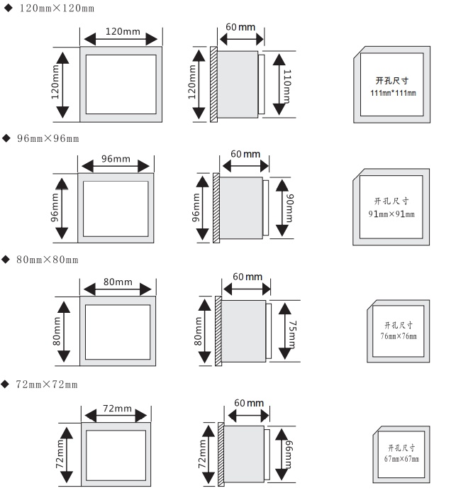 根據儀表外形在上表中選擇對應的安裝開孔尺寸,在安裝屏面上開一個孔,儀表嵌入安裝孔后將兩個夾持件放入儀表殼體的夾持槽內,用手推緊即可。