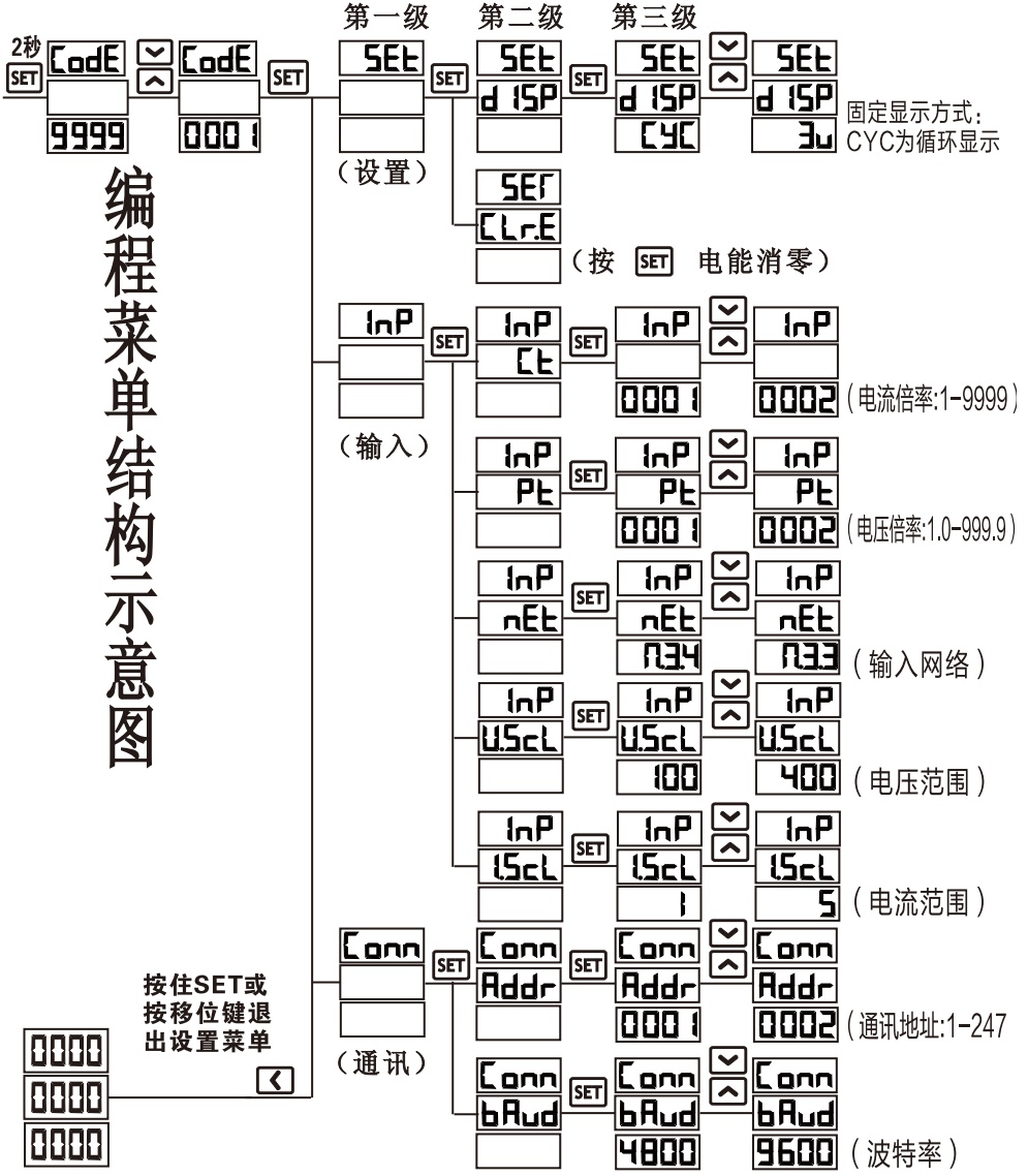 設定鍵:測量顯示狀態下,按該鍵進入編程模式,儀表提示輸入密碼“codE輸入正確的密碼(0001)后,可對儀表進行編程、設置。編程模式下,用于確認菜單項目的選擇和參數值的修改。