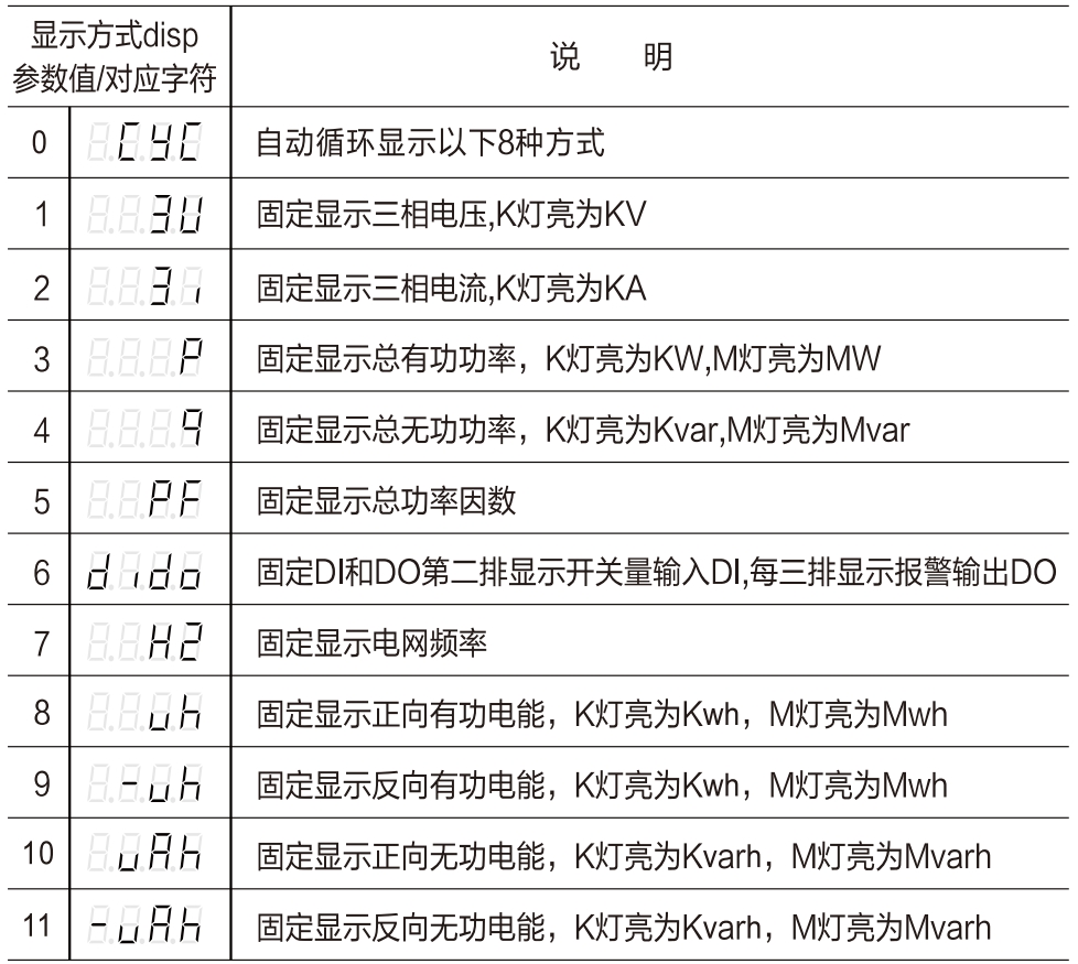 通過對菜單中的“diSP”參數編程,可選擇以下11種顯示方式之一,亦可按“增加鍵”或“減少鍵”來手動切換顯示方式,手動切換顯示后5秒自動返回設定的顯示方式。
