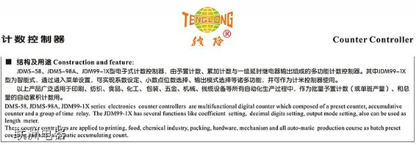 JDMS-58、JDMS-98、JDMS-98A型電子式計數控制器,是由一個三位予置計數器, 一個六位累加計數器,與一個延時繼電器組成的計數控制器總成。計數器采用單片機程序控制, 高亮度led顯示,內裝高容量可充鎳鎘電池,具有無機械磨損、 使用壽命長,可靠性高、顯示清晰、計數響應快等顯著優點. 適用于印刷,食品、化工、包裝、五金、機械等所有自動化生產過程中作為批量予置計數和總量的自動累積計數